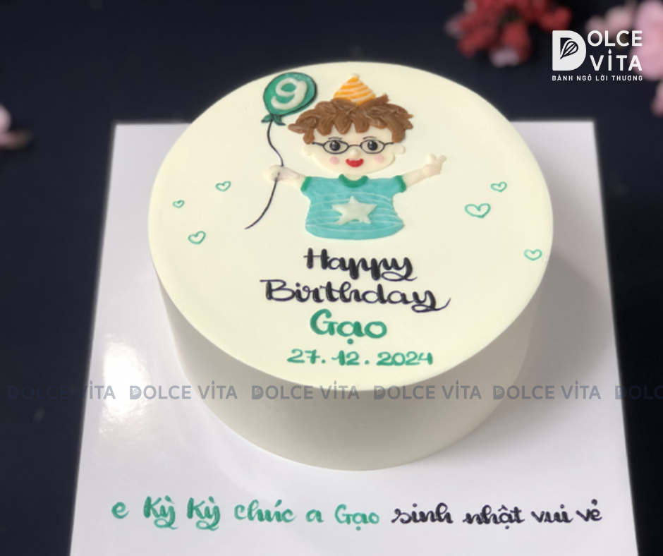 Phủ kem màu tươi sáng, dễ thương – thường là các gam màu pastel như xanh, vàng, trắng… – và có thể thêm chi tiết trang trí như bong bóng, nón sinh nhật, ngôi sao, hoặc món đồ chơi mà bé yêu thích.