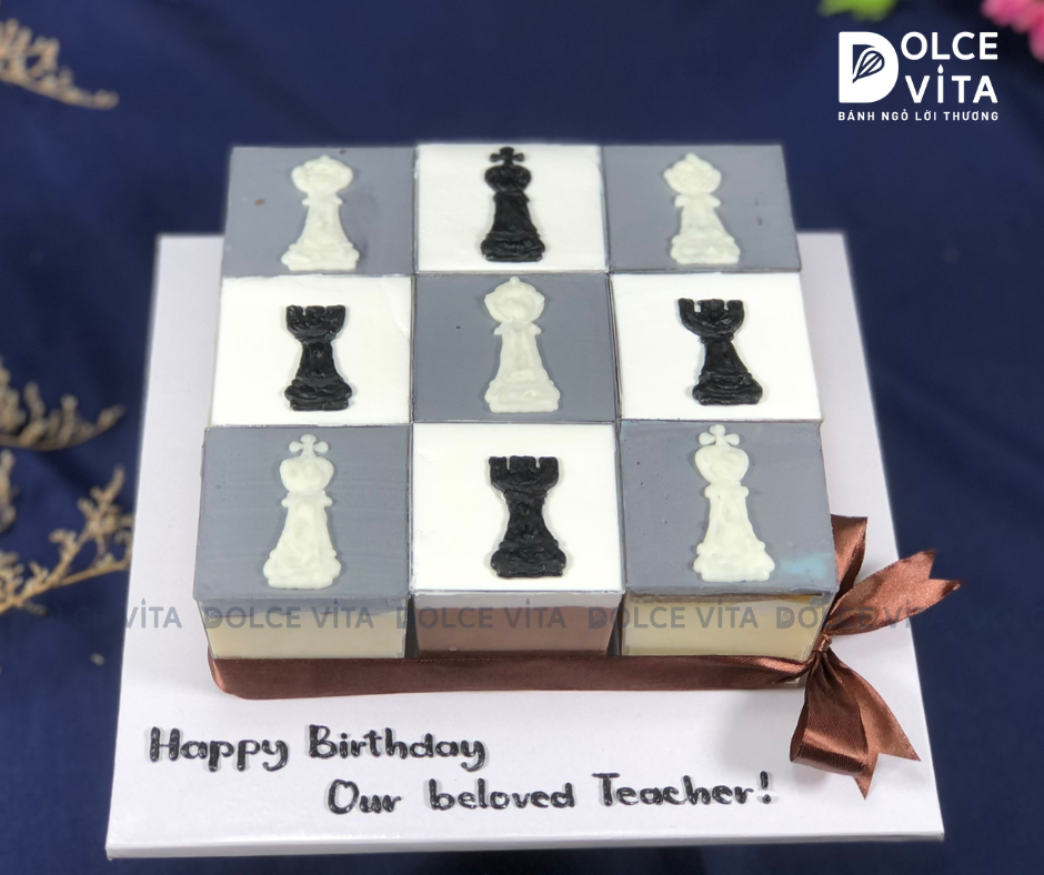 Bánh Sinh Nhật Chủ Đề Cờ Vua - Món Quà Hoàn Hảo Cho Người Yêu Cờ Bạn đang tìm kiếm một chiếc bánh sinh nhật đặc biệt dành cho bé yêu thích cờ vua hoặc một người đam mê bộ môn trí tuệ này? Dolce Vita mang đến mẫu bánh sinh nhật vẽ bàn cờ vua, được trang trí tinh tế với những quân cờ như hậu, vua, xe, mã, tượng..., giúp bữa tiệc thêm phần ấn tượng và đầy cảm hứng! Bánh sinh nhật chủ đề cờ vua không chỉ thể hiện niềm yêu thích của bé với bộ môn này mà còn là một tác phẩm nghệ thuật thực thụ: Trang trí mô phỏng bàn cờ vua với các ô trắng đen, tạo hiệu ứng sống động.