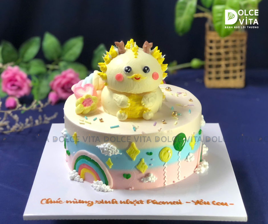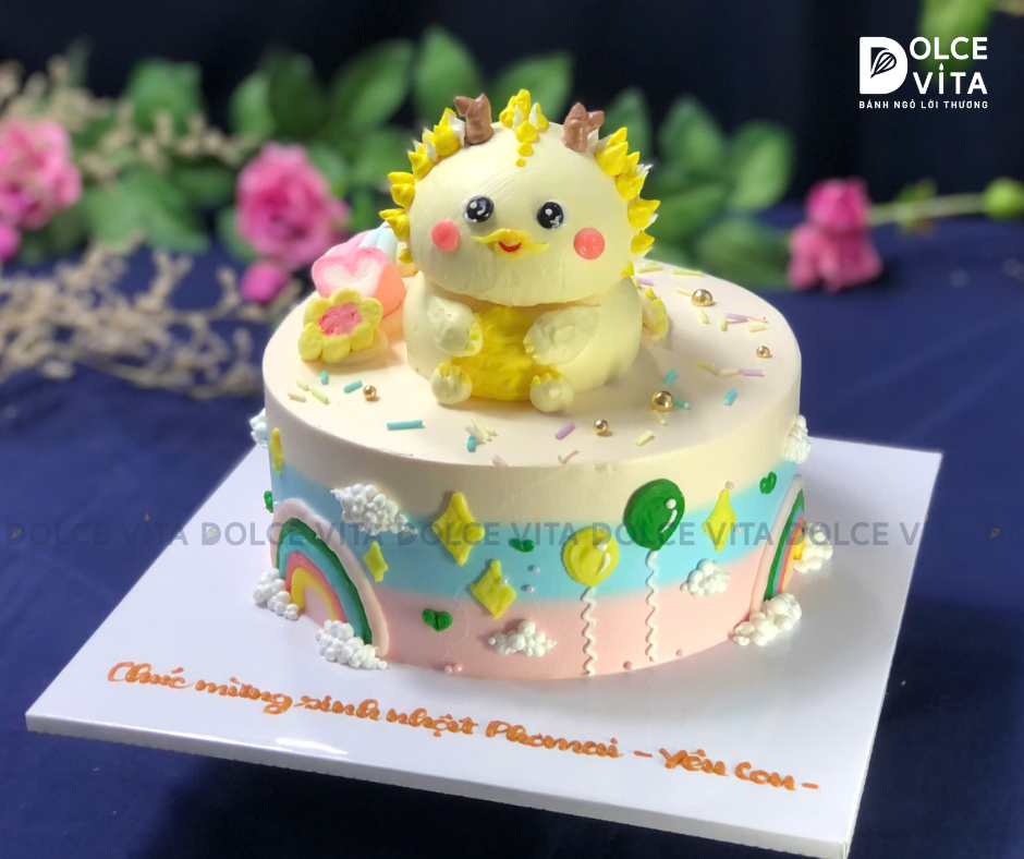 Rồng là hình ảnh quen thuộc, gợi lên sức mạnh, may mắn và sự tốt lành. Chiếc bánh này được làm dành riêng cho các bé sinh năm Rồng hoặc yêu thích hình ảnh con vật huyền thoại này. Từng chi tiết như vảy rồng, đôi mắt tinh nghịch hay chiếc đuôi uốn lượn đều được thợ bánh vẽ tay hoặc tạo hình thủ công, mang đến một chiếc bánh vừa ngon vừa bắt mắt. Với màu sắc tươi sáng và nét trang trí ngộ nghĩnh, chiếc bánh này hy vọng sẽ làm bé vui thích và góp phần làm bữa tiệc sinh nhật thêm phần đáng nhớ, chào đón ngày đặc biệt của bé.