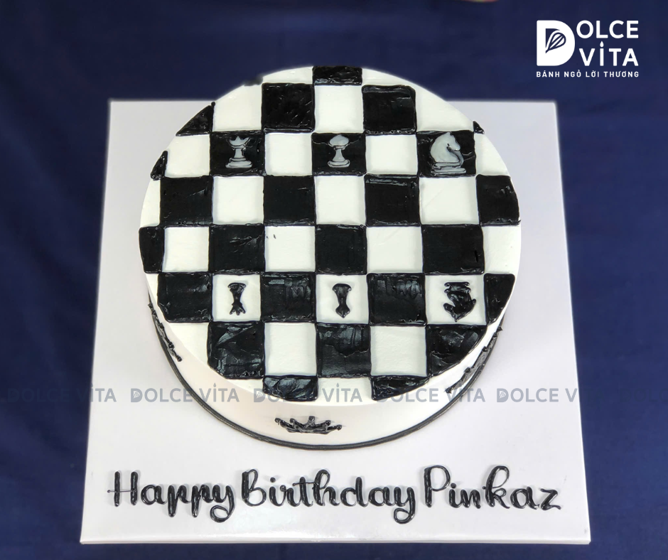 Bánh Sinh Nhật Chủ Đề Cờ Vua - Món Quà Hoàn Hảo Cho Người Yêu Cờ Bạn đang tìm kiếm một chiếc bánh sinh nhật đặc biệt dành cho bé yêu thích cờ vua hoặc một người đam mê bộ môn trí tuệ này? Dolce Vita mang đến mẫu bánh sinh nhật vẽ bàn cờ vua, được trang trí tinh tế với những quân cờ như hậu, vua, xe, mã, tượng..., giúp bữa tiệc thêm phần ấn tượng và đầy cảm hứng! Bánh sinh nhật chủ đề cờ vua không chỉ thể hiện niềm yêu thích của bé với bộ môn này mà còn là một tác phẩm nghệ thuật thực thụ: Trang trí mô phỏng bàn cờ vua với các ô trắng đen, tạo hiệu ứng sống động.