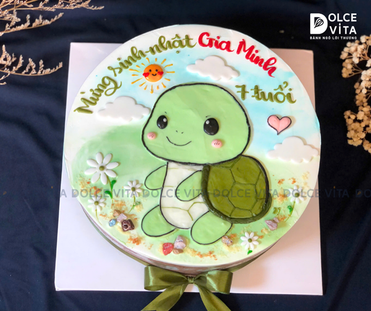 Bánh được trang trí hoàn toàn bằng kem tươi, vẽ tay từng nét: từ mai rùa chấm bi đến ánh mắt hiền lành và nụ cười tủm tỉm. Màu sắc tươi sáng, hài hòa, vừa nổi bật vừa dịu mắt – rất phù hợp để dành tặng các bé trai, bé gái trong dịp sinh nhật, thôi nôi, hoặc đơn giản là một ngày đặc biệt.