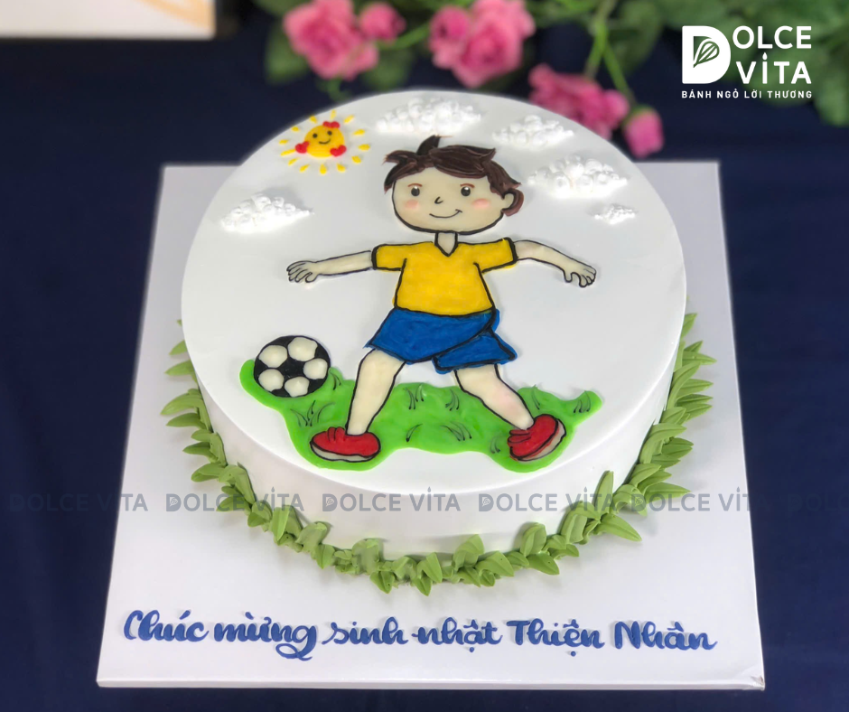Bánh được vẽ tay thủ công hình cầu thủ đang thi đấu trên nền sân cỏ sinh động. Có thể cá nhân hoá theo số áo, màu đồng phục, hay đội bóng mà bạn yêu thích.