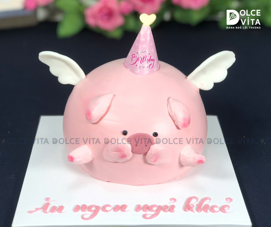 Chiếc bánh được tạo hình đầu chú heo màu hồng đặc trưng, với mũi tròn, tai vểnh và đặc biệt là đôi cánh thiên thần đáng yêu.
