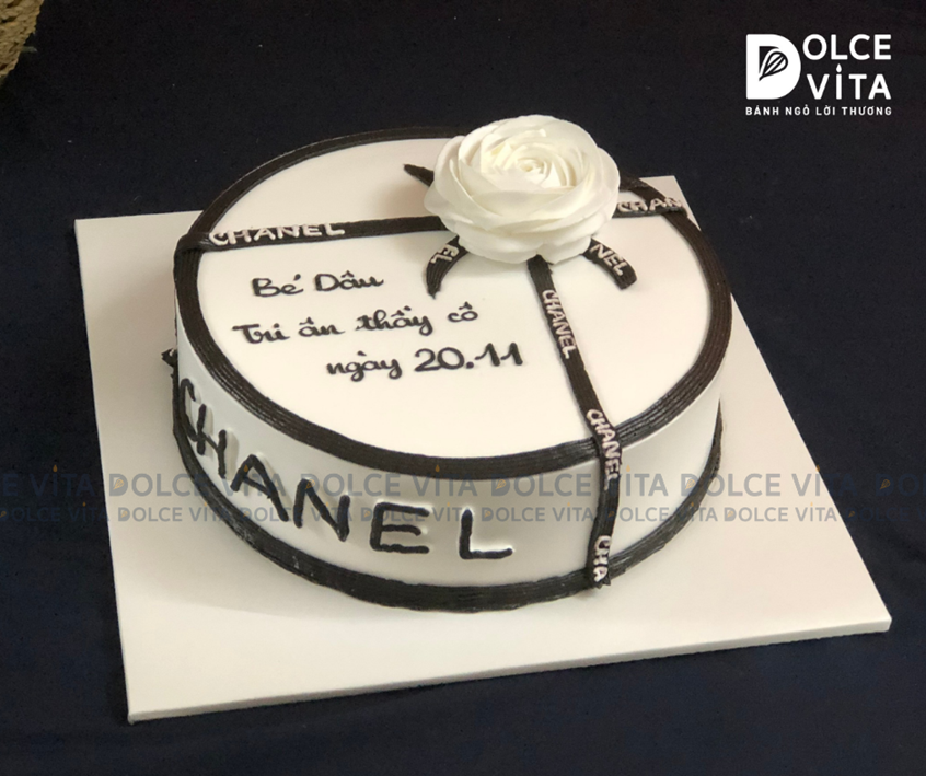 Chiếc bánh được trang trí mô phỏng hộp quà Chanel, với tone đen – trắng kinh điển, tạo nên vẻ đẹp tối giản nhưng đầy đẳng cấp.
