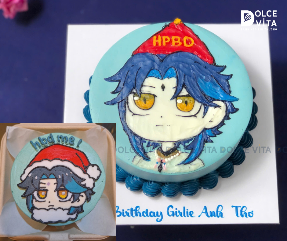Chiếc bánh được trang trí với hình ảnh Xiao – nhân vật được nhiều game thủ Genshin Impact yêu mến, nổi bật với mái tóc xanh đen, đôi mắt vàng và khí chất lạnh lùng bí ẩn.