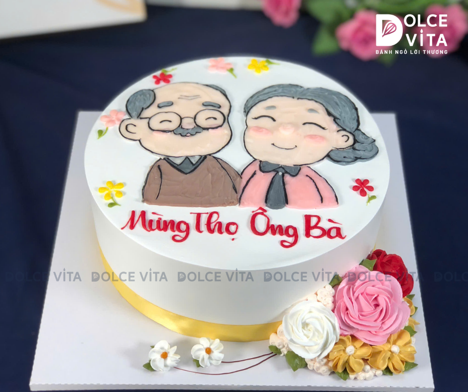 Bánh kem vẽ hình ông bà được phác thảo theo hình chụp hoặc mô tả từ bạn, giữ lại những nét đặc trưng như kiểu tóc, kính, nụ cười… và có thể thêm phông nền đơn giản gợi nhớ không gian quen thuộc của gia đình hay kỉ niệm của bức hình, dấu ấn đặc biệt..