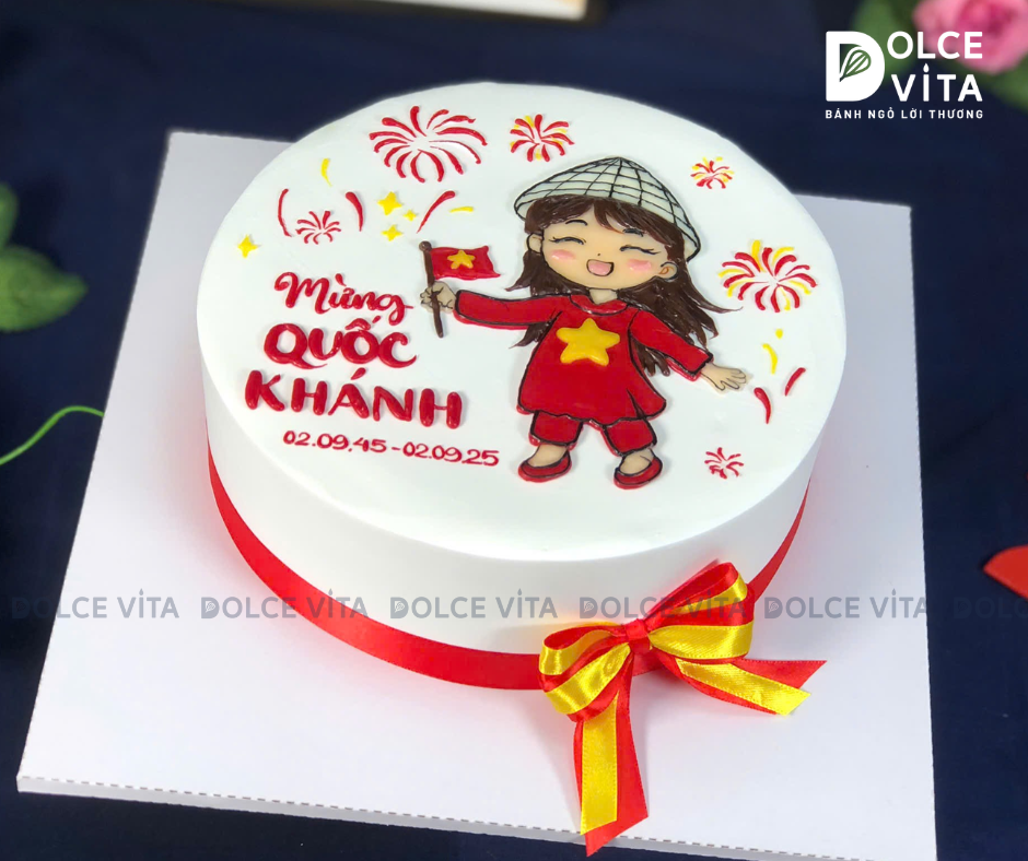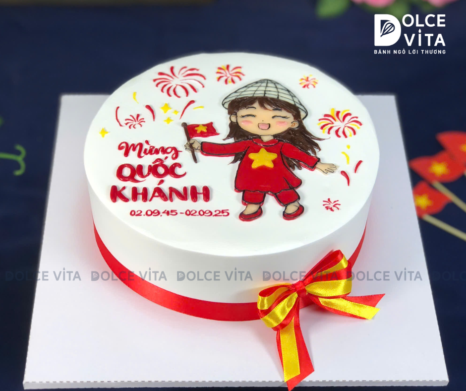 Chiếc bánh được trang trí hình ảnh cô gái mặc áo dài đỏ, in ngôi sao vàng, đội nón lá, tay cầm lá cờ Việt Nam – gương mặt tươi vui, rạng rỡ. Bao quanh là những chi tiết như pháo hoa rực rỡ, tạo nên bức tranh sống động về tinh thần đoàn kết, hân hoan trong những ngày lễ trọng đại.