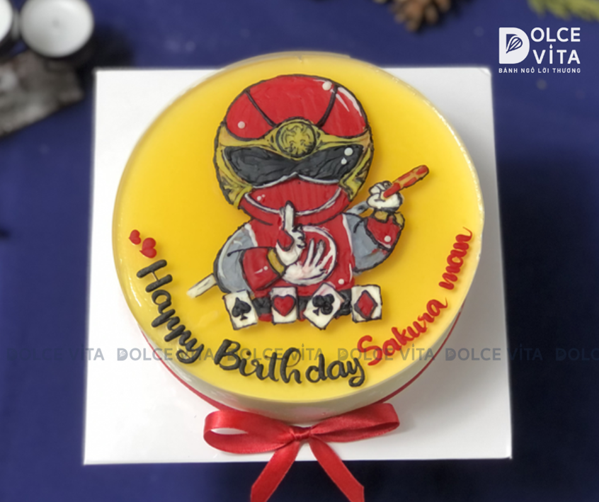 Chiếc bánh được trang trí hình ảnh Siêu Nhân Gao – nhân vật gắn liền với tuổi thơ của nhiều bé trai. Mỗi siêu nhân đều có màu sắc riêng (đỏ, xanh lá, xanh dương, vàng, trắng…) và tiệm có thể vẽ theo đúng nhân vật mà yêu thích. Hình ảnh siêu nhân "chế" đang chơi bài rất phù hợp cho những người lớn cá tính