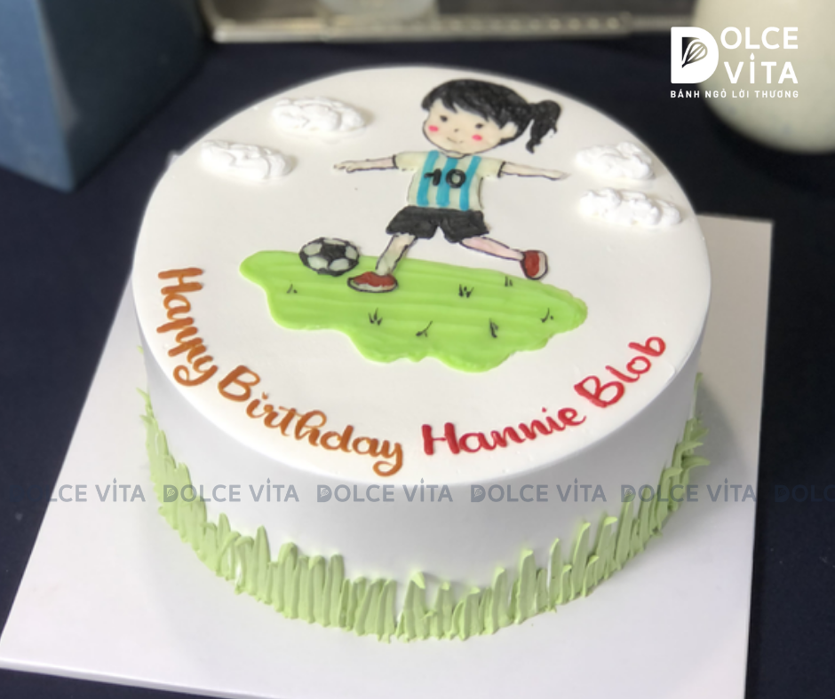 Bánh có thể vẽ bé gái trong bộ đồng phục với số áo riêng, hoặc khoác lên mình màu áo và số áo của cầu thủ nữ mà bé hâm mộ. Nền xanh cỏ, khung thành, trái bóng, và chi tiết sân bóng được thể hiện sinh động, tạo cảm giác như một trận đấu thu nhỏ ngay trên bàn tiệc.