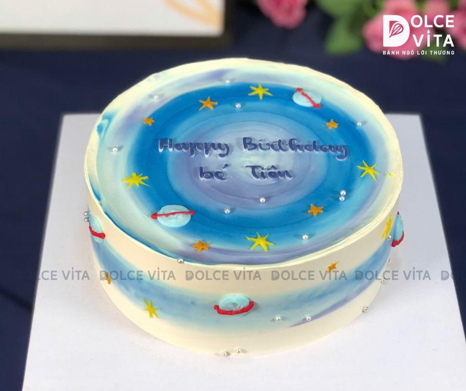 Với lớp kem xanh dương mịn màng làm nền, chiếc bánh gợi nhắc đến không gian bao la ngoài kia. Trên đó, những chi tiết lấp lánh ánh sao, hình vẽ sao Thổ cùng các vì tinh tú trong hệ Mặt Trời được điểm xuyết khéo léo, tạo cảm giác vừa huyền bí vừa gần gũi.