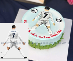Chiếc bánh được phác họa chân dung cầu thủ Cristiano Ronaldo – CR7 theo phong cách vẽ tay độc đáo: hình ảnh áo số 7 quen thuộc, những tư thế ăn mừng biểu tượng đầy khí chất, hay những khoảnh khắc dứt điểm bùng nổ trên sân cỏ – tất cả đều được thể hiện sống động và đầy cảm xúc trên mặt bánh.
