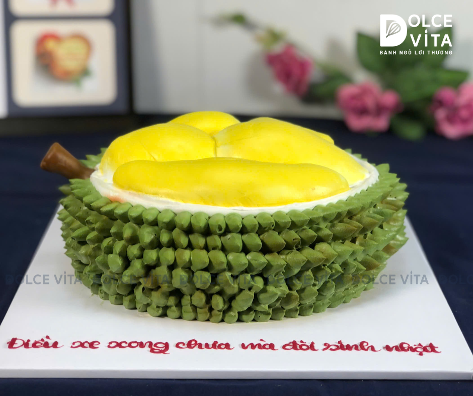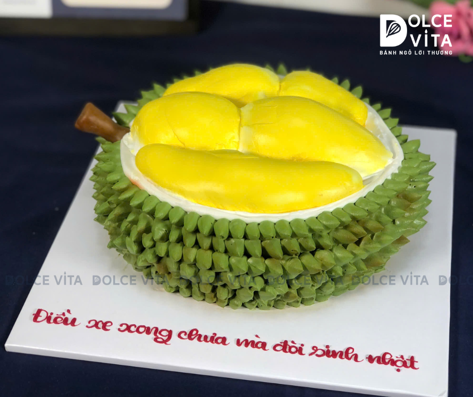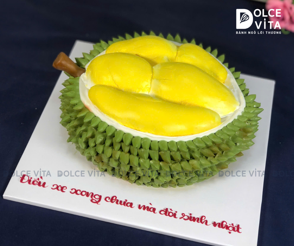 Không chỉ là một chiếc bánh, đây chính là “tác phẩm” dành riêng cho những ai mê mẩn hương vị sầu riêng. Bánh được tạo hình quả sầu riêng sống động với lớp vỏ gai nhọn tỉ mỉ, sắc nét, kết hợp phần múi sầu riêng vàng óng béo ngậy – tất cả đều được làm từ kem và nguyên liệu ăn được, vừa chân thật vừa hấp dẫn.