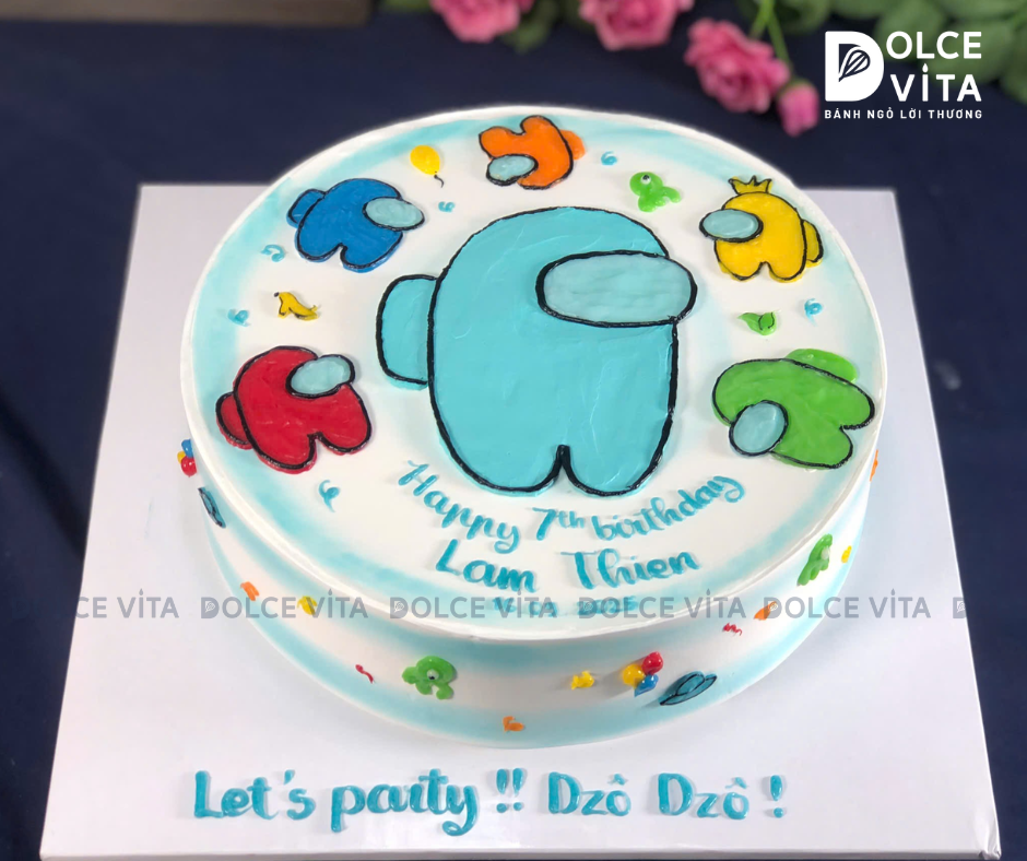 👾 Bánh có thể vẽ nhân vật Among Us ở nhiều tư thế, đội mũ sinh nhật, cầm bóng bay, hoặc tạo hình một nhóm “đồng đội” đang khám phá không gian. Bạn cũng có thể yêu cầu vẽ theo số tuổi, tên bé, hoặc chi tiết hài hước như “Ai là impostor?” – để thêm phần vui nhộn cho tiệc sinh nhật.