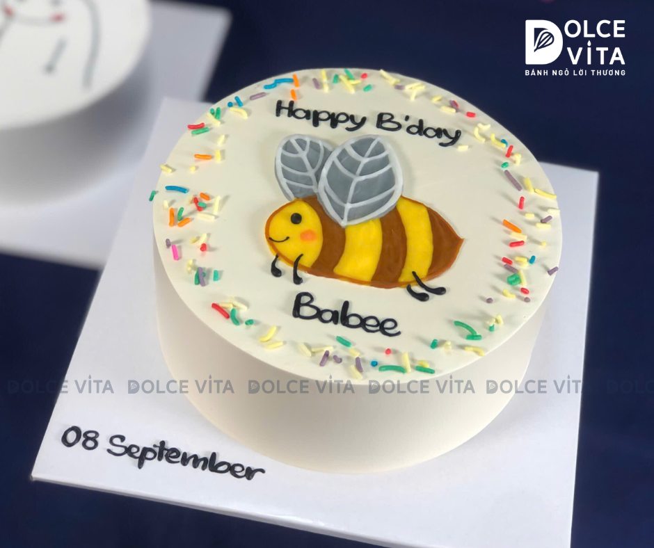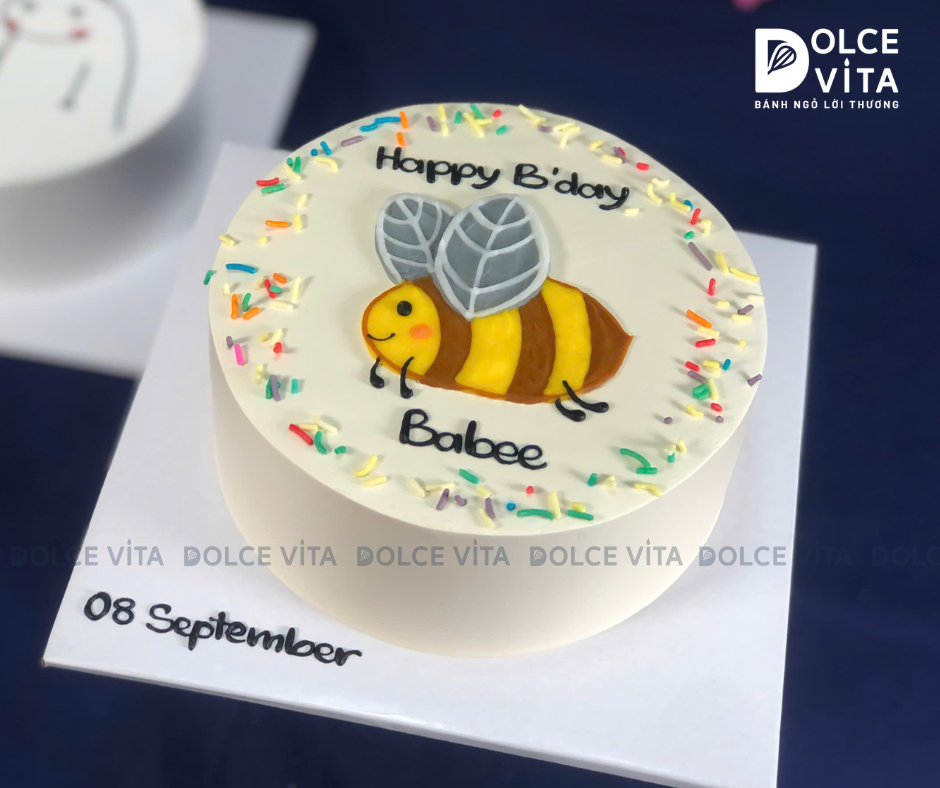 Một chú ong nhỏ nhắn, đôi cánh trong veo, thân mình vàng đen nổi bật… nay xuất hiện trên chiếc bánh kem với phong cách tươi sáng và đáng yêu. Hình vẽ chú ong không chỉ dễ thương, mà còn mang đến năng lượng tích cực, vui nhộn cho bữa tiệc.