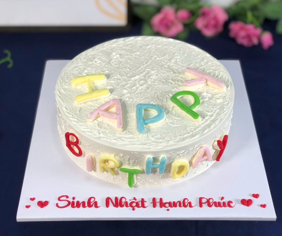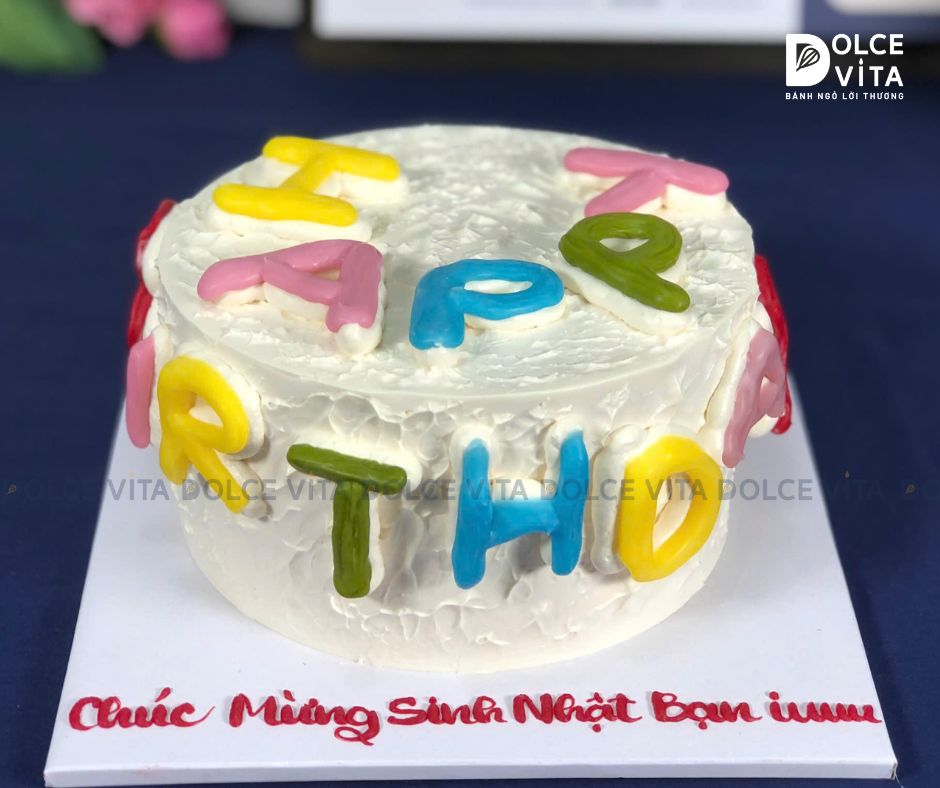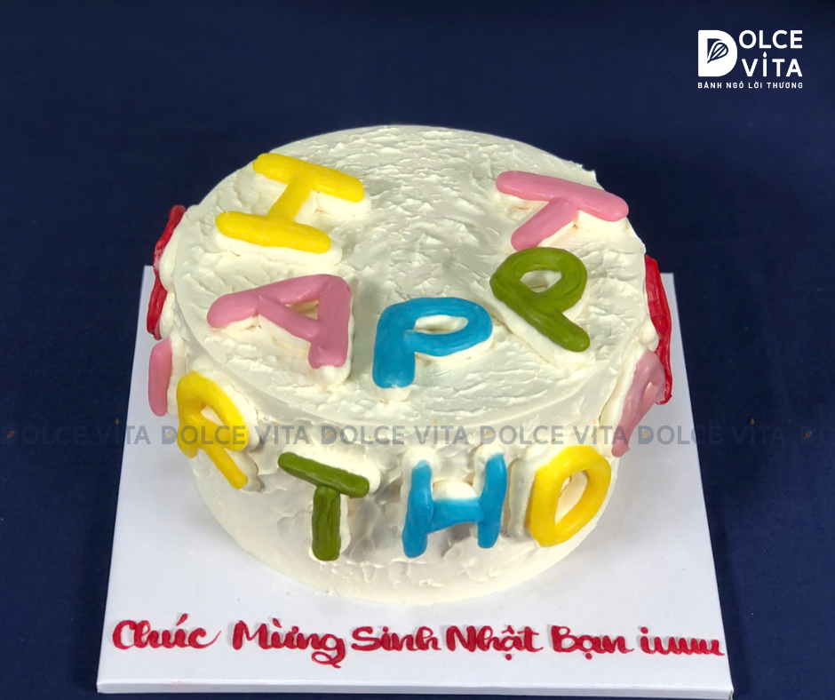 Một chiếc bánh có khi không cần quá cầu kỳ để gây ấn tượng — chỉ cần lớp kem phủ theo phong cách tự nhiên, cố tình gồ ghề cùng những chữ nổi 3D nhiều màu sắc rực rỡ, là đã đủ để khiến bữa tiệc bừng sáng. Mặt bánh giữ phông nền kem trắng/nguyên bản, tạo nền tối giản để các chữ cái nổi màu sắc đối lập trở thành điểm nhấn chính, vừa trẻ trung vừa vui nhộn.