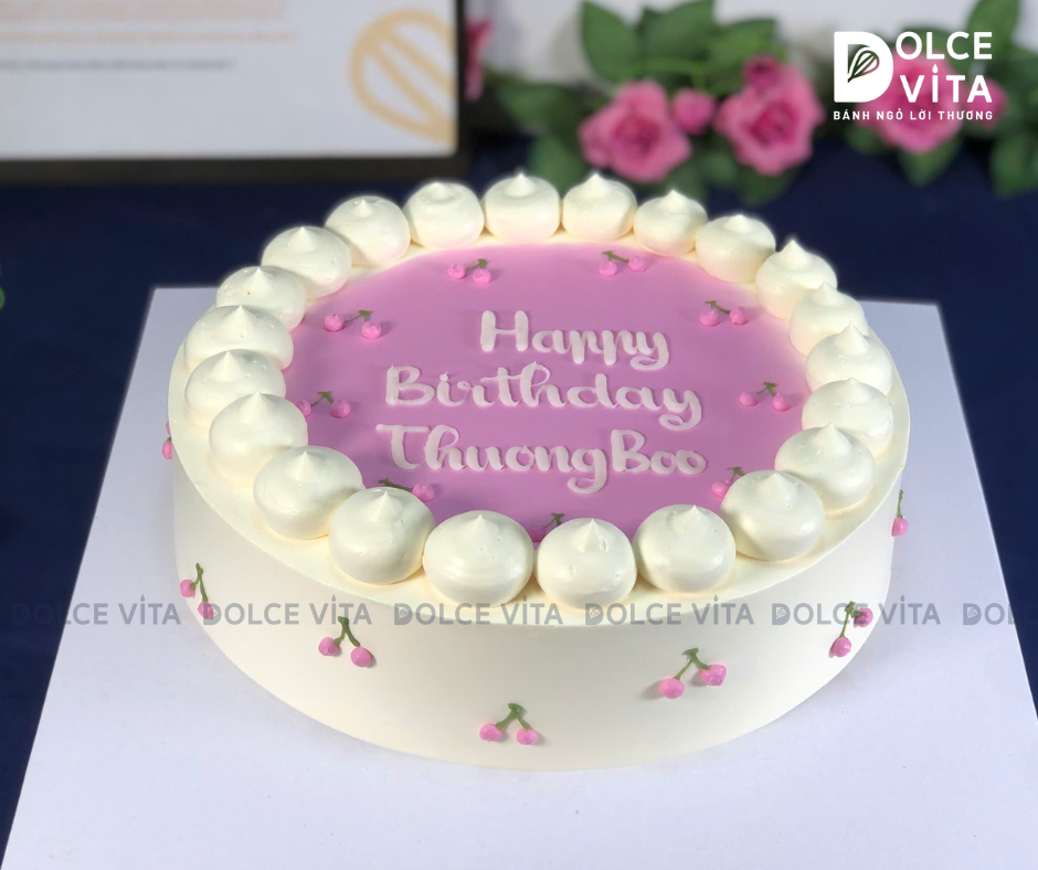 Tone tím tượng trưng cho sự thủy chung, lãng mạn và một tình yêu bền bỉ. Khi kết hợp cùng cherry – biểu tượng của sức sống và niềm vui – chiếc bánh trở thành món quà vừa nữ tính, tinh tế mà vẫn trẻ trung và tươi tắn. Một cách thể hiện tình cảm nhẹ nhàng, ngọt ngào mà không cần lời nói.