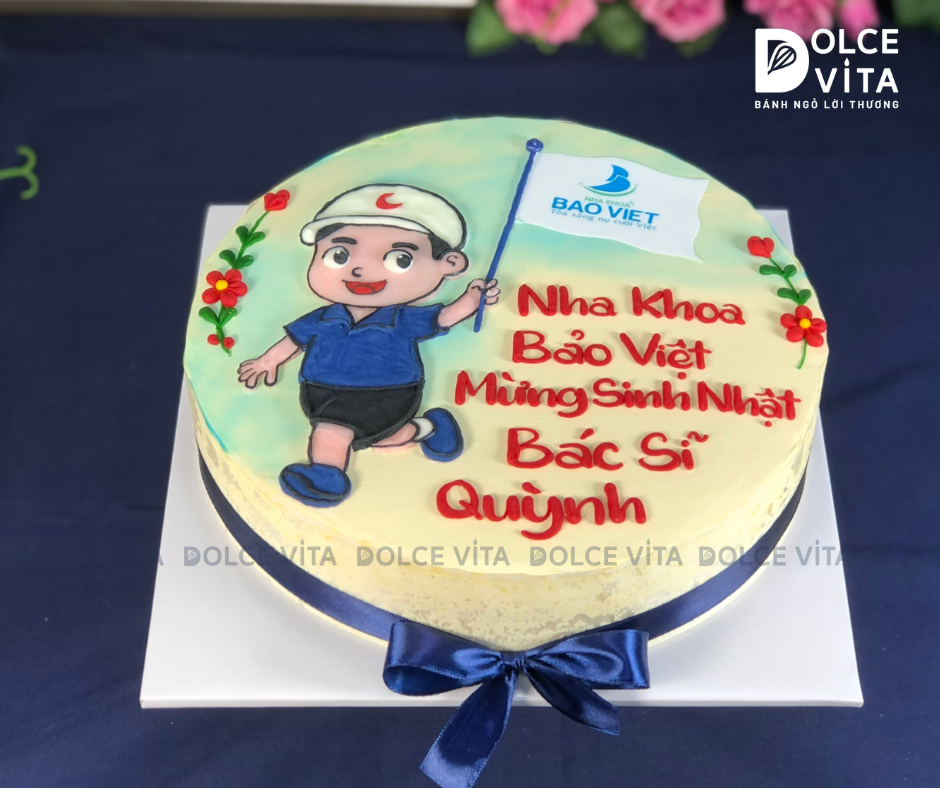 Chiếc bánh được trang trí với hình ảnh nam thanh niên cầm lá cờ tung bay, mang tinh thần vươn lên, chinh phục và tự hào. Hình vẽ có thể tùy chỉnh theo ý nghĩa bạn muốn gửi gắm — từ lá cờ Tổ quốc thể hiện tinh thần yêu nước, đến lá cờ mang logo doanh nghiệp biểu trưng cho sự đoàn kết và thành công tập thể.