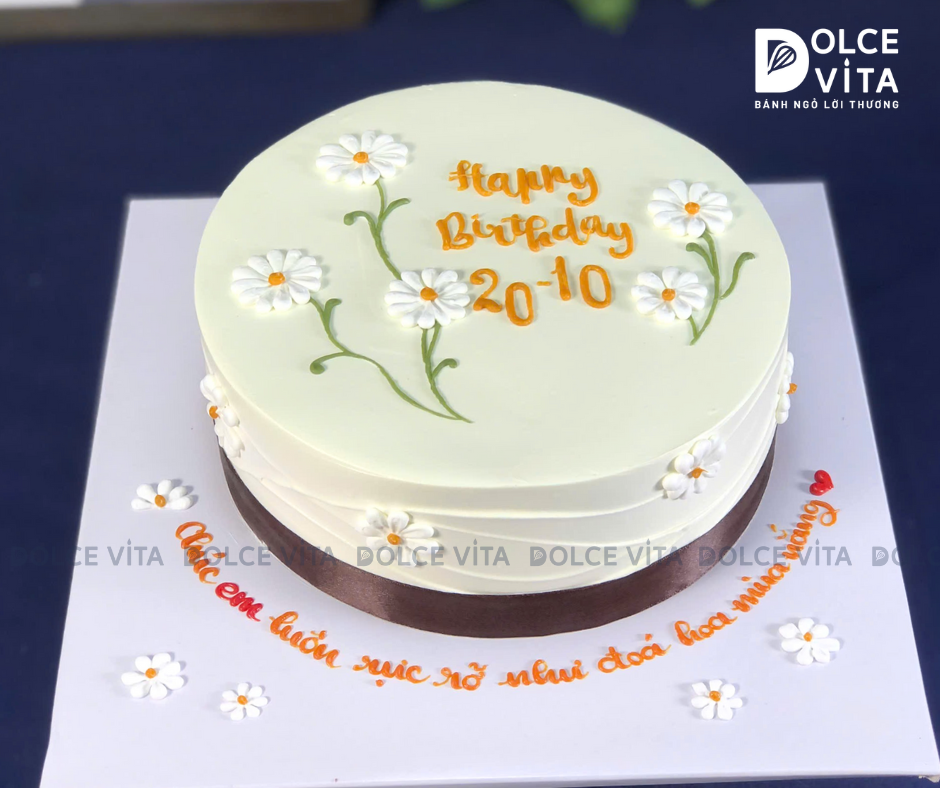 Lấy cảm hứng từ những đóa cúc trắng mong manh, chiếc bánh kem được trang trí bằng những bông hoa vẽ bằng kem sữa tươi mềm mịn, tạo nên vẻ ngoài nhẹ nhàng, nữ tính nhưng vẫn gây ấn tượng bởi sự tinh tế và hài hòa trong từng chi tiết.
