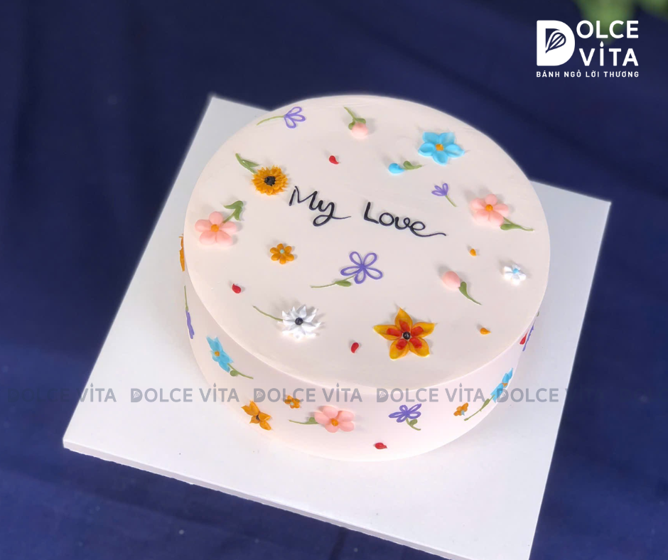 Chiếc bánh mang phong cách nhẹ nhàng và tinh tế, được trang trí bằng những bông hoa nhỏ xinh cùng các họa tiết mềm mại, tạo cảm giác như một bức tranh hoa dịu dàng giữa nền kem mịn.