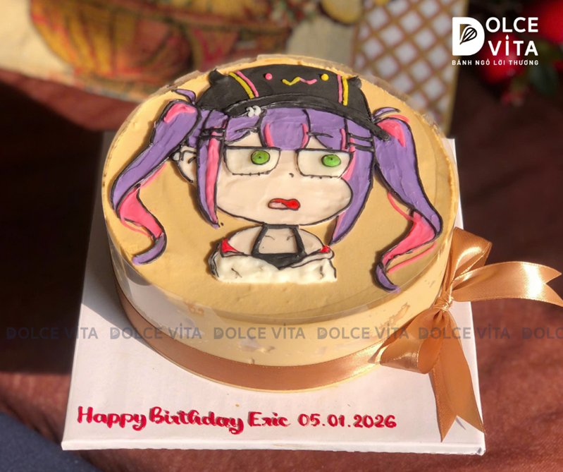 Với những ai yêu thích VTuber và văn hoá anime, Tokoyami Towa là một nhân vật rất dễ nhận ra: mái tóc tím đặc trưng, đôi mắt xanh nổi bật và tạo hình cá tính nhưng gần gũi. Chiếc bánh kem vẽ nhân vật này được tiệm thực hiện theo phong cách vẽ tay – nét gọn – dễ thương, tập trung vào những chi tiết đặc trưng để nhìn vào là nhận ra ngay nhân vật.