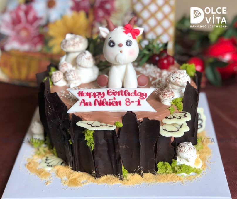 Chiếc bánh được tạo hình theo concept khúc cây trong rừng, với phần vỏ cây sần sùi làm từ socola ôm trọn thân bánh, tạo cảm giác mộc mạc và sinh động. Trên mặt bánh là chú dê nhỏ được nặn thủ công, kết hợp cùng các chi tiết trang trí như nấm, kem tuyết, rêu xanh… gợi không khí rừng núi nhẹ nhàng, đáng yêu.