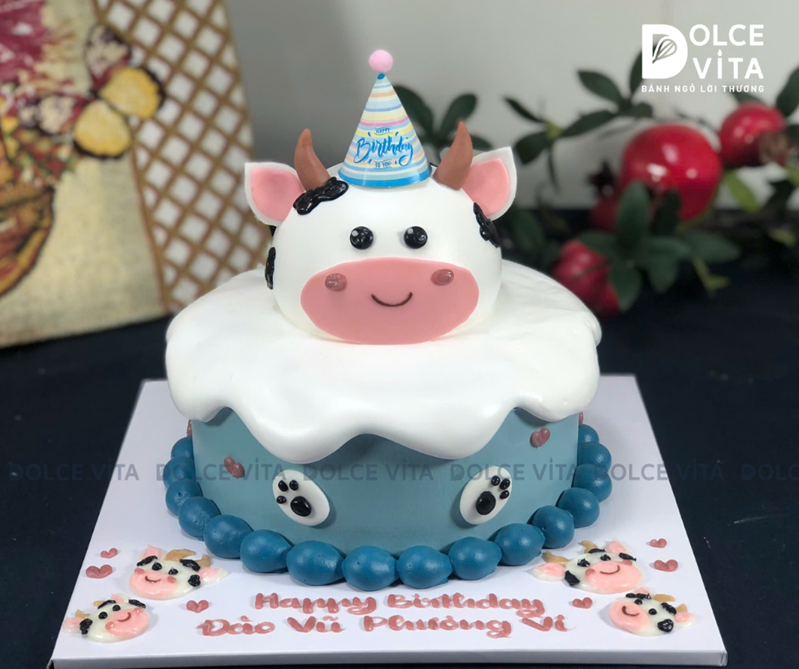 Chiếc bánh kem tạo hình chú bò mang dáng vẻ tròn trịa, hiền lành và nụ cười dễ thương, rất phù hợp cho những bữa tiệc sinh nhật nhẹ nhàng, ấm áp.