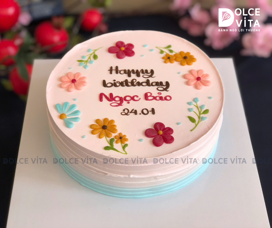 Chiếc bánh mang phong cách nhẹ nhàng và tinh tế, được trang trí bằng những bông hoa nhỏ xinh cùng các họa tiết mềm mại, tạo cảm giác như một bức tranh hoa dịu dàng giữa nền kem mịn.