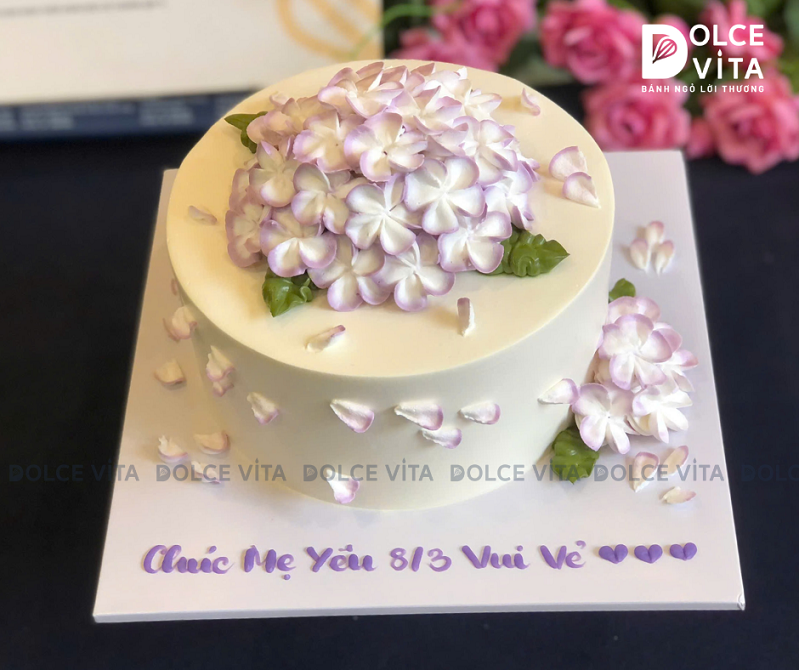 Hoa cẩm tú cầu tượng trưng cho sự biết ơn, gắn bó và những cảm xúc chân thành khó nói thành lời. Trên nền bánh kem mềm mịn, từng bông hoa được nặn bằng kem với những cánh tròn nhỏ xinh, tạo nên cảm giác dịu dàng và thanh nhã – như chính những người phụ nữ bạn muốn gửi tặng.
