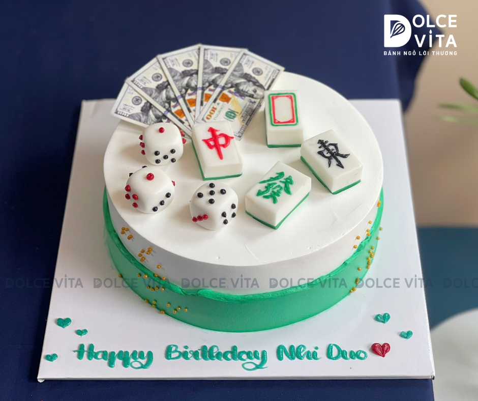 Chiếc bánh lấy cảm hứng từ bàn chơi Baccarat, thường vẽ lá bài, chip, xúc xắc... theo phong cách vui nhộn, độc đáo. Phù hợp cho những buổi tiệc bạn bè, sinh nhật người có cá tính mạnh hoặc thích trò chơi may rủi như một điểm nhấn bất ngờ.
