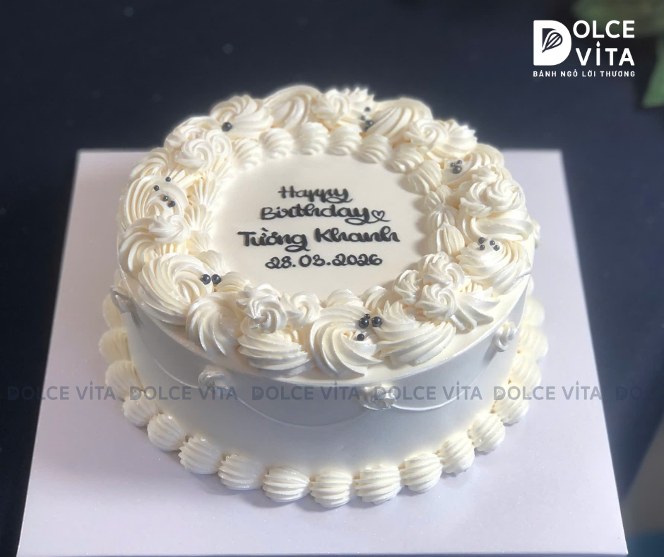 Lấy cảm hứng từ những chiếc bánh sinh nhật kiểu cổ điển, phần kem được bắt hoa văn mềm mại quanh mặt bánh và thành bánh, tạo cảm giác quen thuộc nhưng chưa bao giờ lỗi thời. Tổng thể tone trắng giúp chiếc bánh dễ nhìn, sang nhẹ và lên hình đẹp trong nhiều không gian tiệc khác nhau.