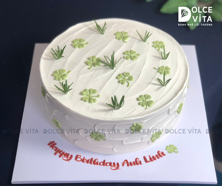 🍀 Bề mặt bánh được trang trí những chiếc cỏ bốn lá nhỏ xinh nổi bật trên nền kem trắng, tạo cảm giác tinh khôi và nhẹ mắt. Các chi tiết được sắp xếp vừa đủ, phù hợp với người thích phong cách tối giản nhưng vẫn có ý nghĩa riêng.