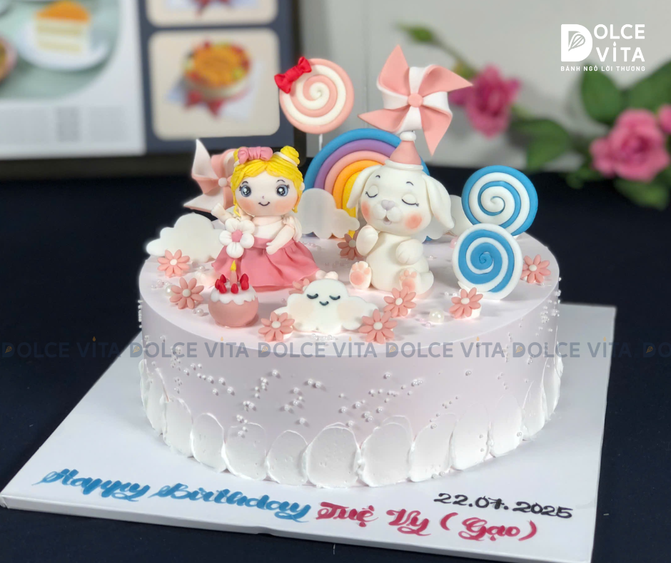 Chiếc bánh là một thế giới tuổi thơ thu nhỏ, được tạo hình hoàn toàn bằng fondant: bé gái phong cách chibi ngộ nghĩnh, kẹo mút sắc màu, chong chóng, cầu vồng bảy sắc rực rỡ… Mỗi chi tiết đều được nặn tay thủ công, tỉ mỉ và sống động, tạo nên một tổng thể hài hòa và tràn đầy niềm vui.
