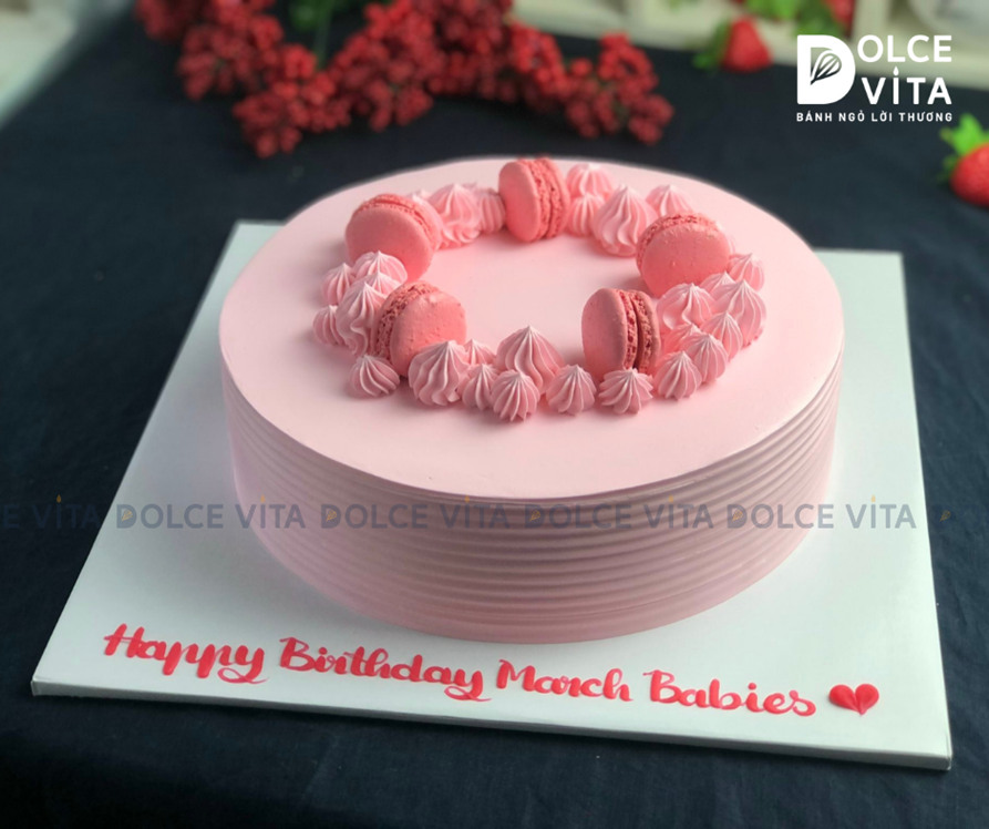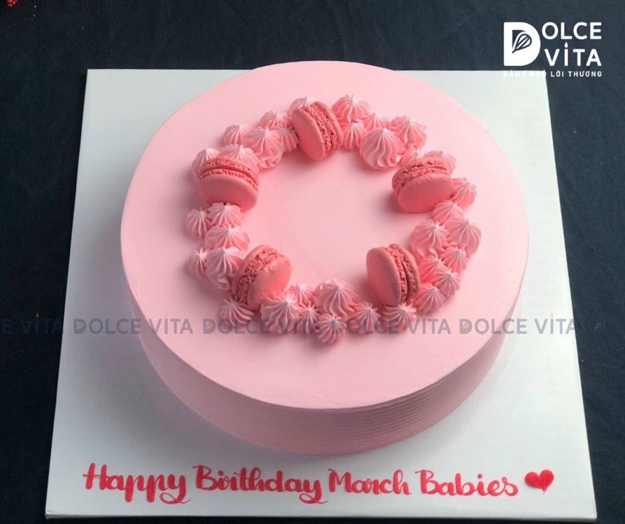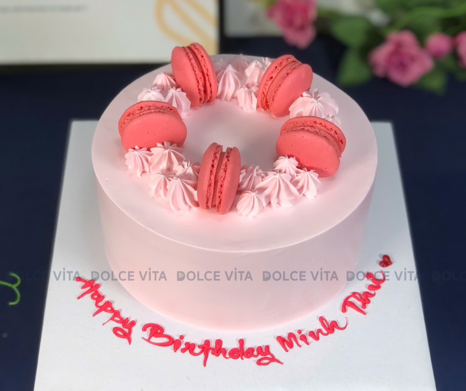 Bánh được phủ lớp kem mịn màng, phối màu hồng pastel, hồng phấn hay hồng đậm tùy theo mong muốn. Những chiếc macaron giòn nhẹ, nhân ngọt vừa phải, được đặt tinh tế trên mặt bánh, tạo thành điểm nhấn sang trọng và trẻ trung. Đây là mẫu bánh dễ “ghi điểm” với nhiều đối tượng, đặc biệt là các bé gái, bạn nữ, hay những ai yêu thích sự nhẹ nhàng và nữ tính.