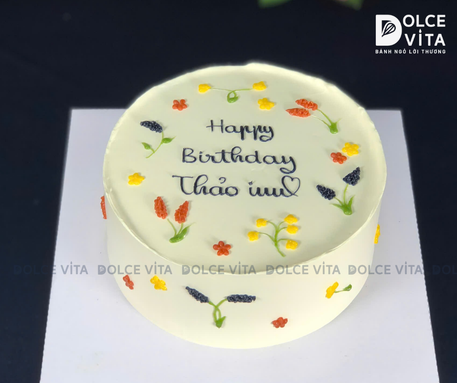 Bánh được vẽ tay tỉ mỉ với họa tiết hoa nhí trên nền kem mịn, tạo nên tổng thể nhẹ nhàng, trang nhã. Đây là món quà tuyệt vời để gửi tặng trong các dịp: