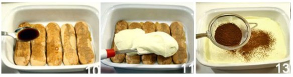 Với Tiramisu truyền thống, Savoiardi sẽ được nhúng qua cà phê (có thể thêm ít rượu) để  bánh thơm, mềm và xốp (vì Savoiardi  giòn, cứng) và đặt ở dưới khuôn. Savoiardi chỉ thấm vừa cà phê cho mềm chứ không để quá ướt, sũng nước sẽ không ngon. Sau đó đến hỗn hợp Mascarpone, trứng (có thể thêm panna - tương tự Whipping cream) đã  được cho thêm ít rượu vào để khử mùi trứng. Thực ra, mùi rượu không nồng lắm, chỉ đủ để át đi mùi của trứng. Sau hai lớp Savoiardi và kem Mascarpone như vậy, cacao sẽ được phủ lên trên cùng.