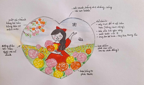 Mẹ tên Hồng. Người con gái ấy đã vẽ mẹ mình giữa một vườn hoa hồng rực rỡ, nơi những cánh bướm chập chờn bay và cành hồng xuân đang khoe sắc.