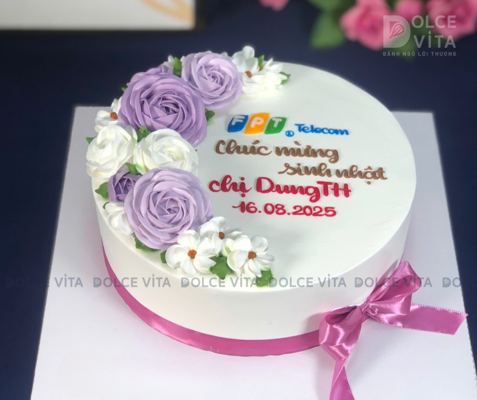 Chiếc bánh mang phong cách thanh lịch, duyên dáng với sắc tím và trắng, mang lại cảm giác nữ tính, nhẹ nhàng, rất hợp với các dịp như quà tặng sinh nhật cho mẹ, chúc mừng ngày của phụ nữ (8/3, 20/10), hoặc làm món quà ý nghĩa cho những sự kiện đặc biệt dành cho phái đẹp.