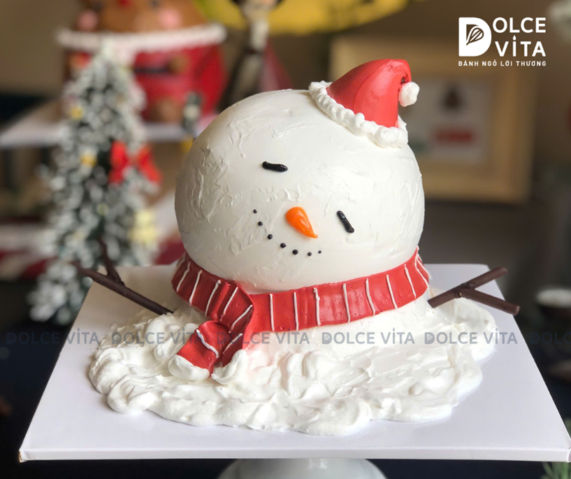 Chiếc bánh tạo hình người tuyết với dáng tròn đáng yêu, đội mũ Noel và choàng khăn đỏ mang đến cảm giác vui tươi, gần gũi của mùa Giáng sinh. Các chi tiết được tạo hình thủ công từ kem và nguyên liệu ăn được, phối màu trắng – đỏ quen thuộc, gợi không khí mùa đông ấm áp.